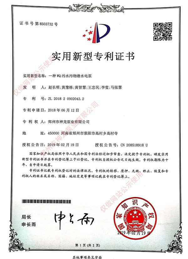 井用潜水电动机专利证书